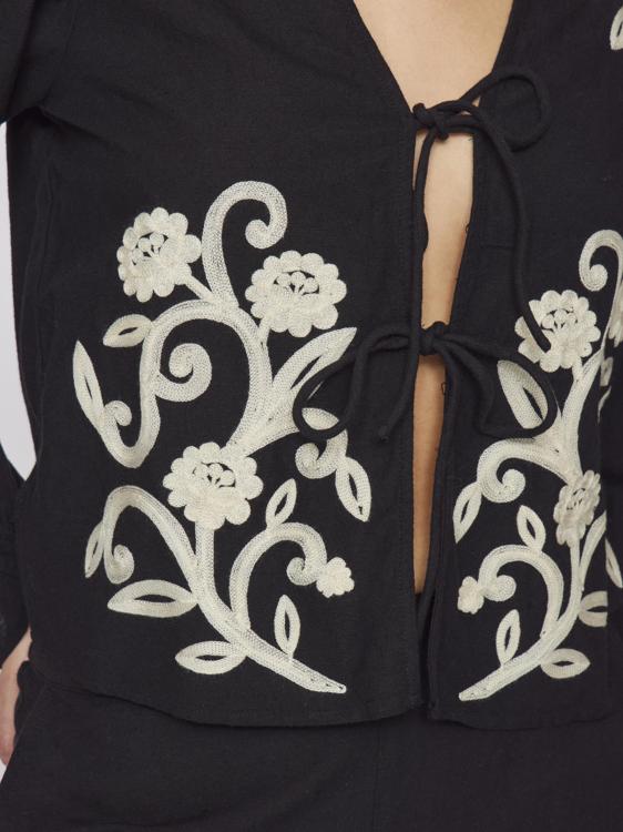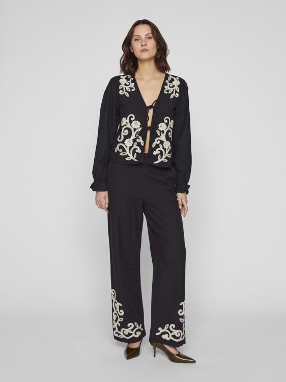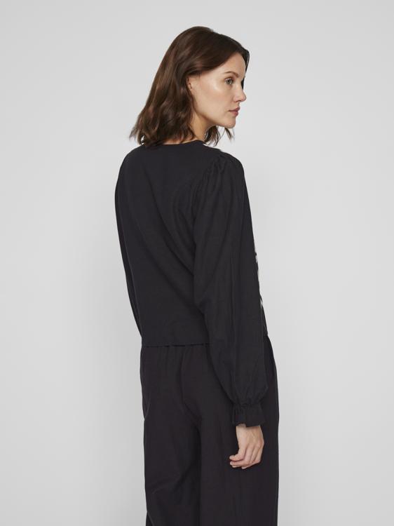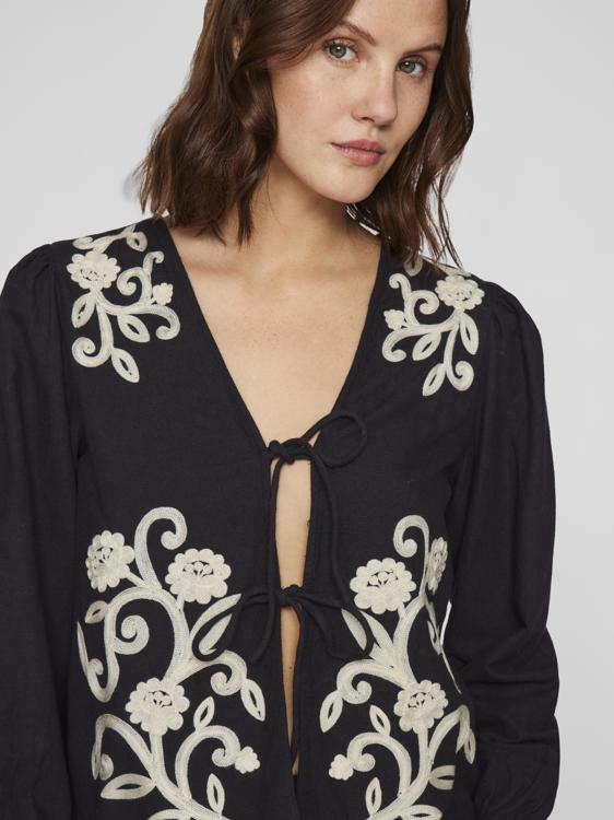 Deze zwarte top van Vila is een ware blikvanger. De top heeft een V-hals en een striksluiting aan de voorkant, wat zorgt voor een unieke en vrouwelijke uitstraling. De lange mouwen en elastische manchetten geven de top een comfortabele pasvorm. De gedetailleerde afwerking met sierlijke applicaties maakt deze top tot een bijzonder item.