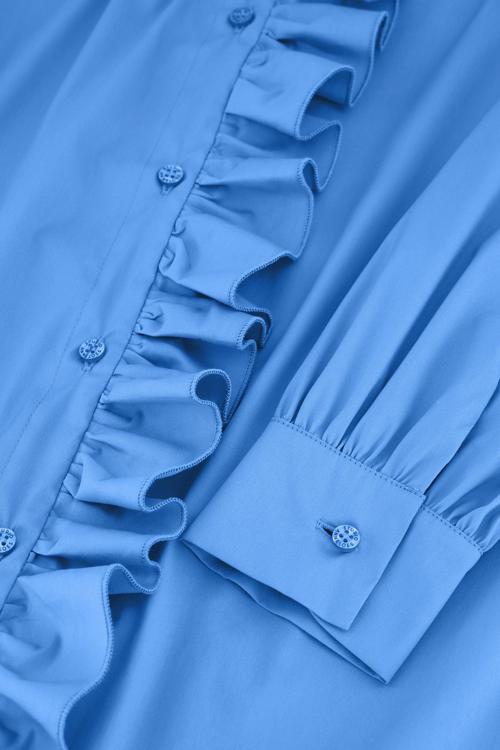 - Elegante ruffles: De verfijnde ruffles die langs de knopenlijst lopen, geven de blouse een romantische en vrouwelijke touch.