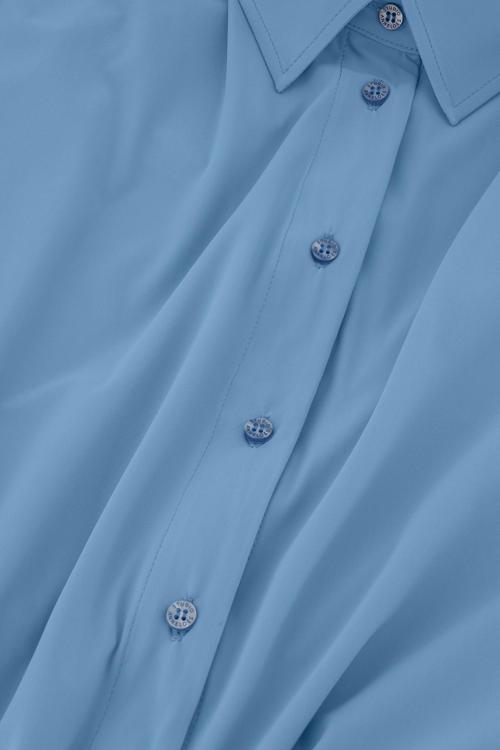 De Lena blouse geeft een stijlvolle draai aan het klassieke overhemd. Dit ontwerp in de verfijnde kleur Mid Blue combineert een traditionele kraag en knoopsluiting met een elegant knoopdetail aan de voorzijde. Dit speelse accent geeft de blouse een moderne, vrouwelijke uitstraling en accentueert je taille op een subtiele manier. Gemaakt van de befaamde lichte Travelstof, is dit de perfecte keuze voor een look die zowel gekleed als comfortabel is.