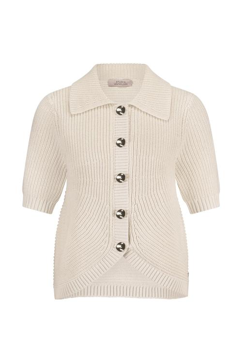 De Cosa cardigan van Studio Anneloes is een item waarin een klassiek ontwerp en een moderne textuur prachtig samenkomen. Dit bijzondere, grofgebreide vest in de zachte kleur Kit is een ware aanwinst voor je garderobe. De combinatie van de traditionele polokraag met de korte mouwen geeft een verrassende en frisse uitstraling. Het is een kledingstuk dat zowel comfortabel als stijlvol is, ontworpen voor de vrouw die oog heeft voor unieke details en hoogwaardige kwaliteit.