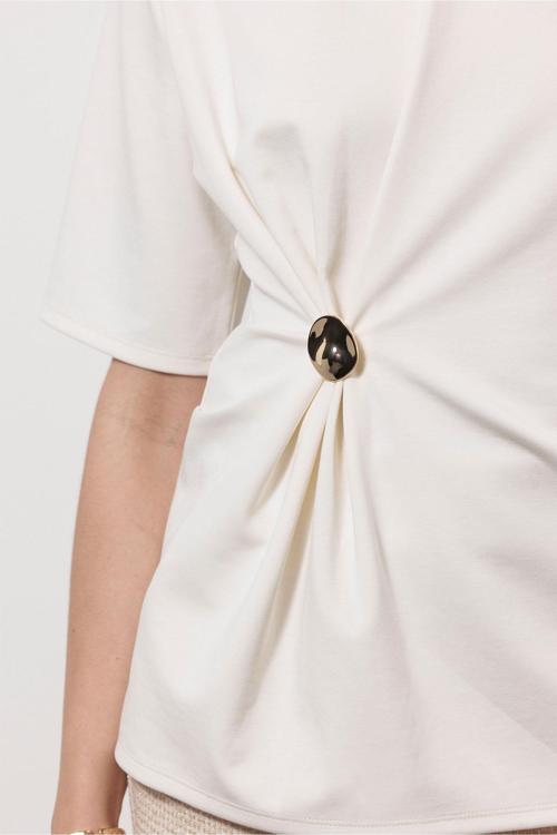 Ontdek de verfijnde eenvoud van de Almamia top. Dit kledingstuk is de perfecte aanvulling op je garderobe en combineert een tijdloos ontwerp met een uniek detail. De zachte ecru kleur vormt een prachtig canvas voor de elegante draperie, die je figuur op een subtiele manier accentueert. Voel je direct goed in dit ontwerp dat zowel comfort als klasse uitstraalt.