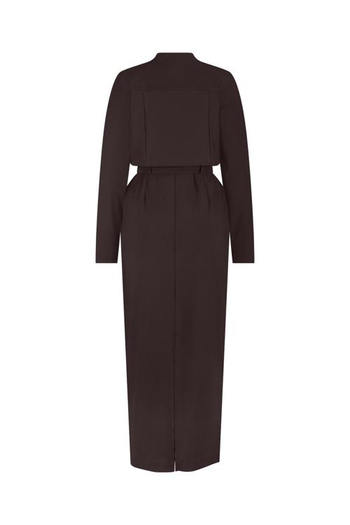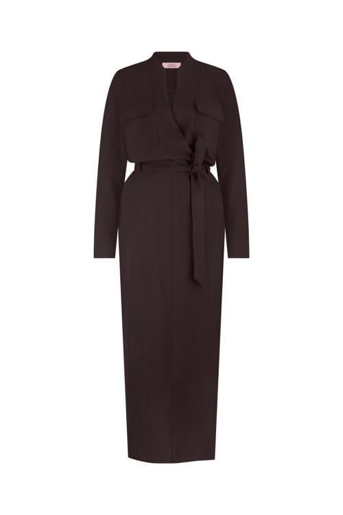 De Jette cargo dress van Studio Anneloes is de belichaming van een krachtige, moderne vrouwelijkheid. Dit is niet zomaar een jurk; het is een statement of intent. Het ontwerp combineert op een gedurfde manier de stoere, functionele details van een cargo-stijl met de tijdloze elegantie van een overslagjurk. Gemaakt van de befaamde, stevige Heavy Travelstof in een diepe 'Espresso' kleur, is dit een jurk die je een onmiskenbaar zelfverzekerd gevoel geeft.