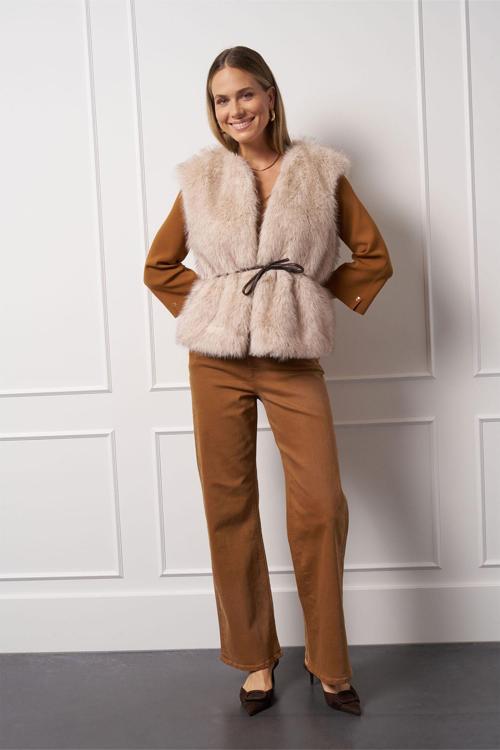 Het Ivana gilet van Studio Anneloes is pure, aaibare luxe. Dit is het item dat je pakt om elke outfit direct een gevoel van warmte, textuur en high-fashion glamour te geven. Het gilet is volledig gemaakt van een weelderig, langharig faux fur in een tijdloze, zachte ecrukleur. Het contrast met het stoere, (imitatie)leren strikkoord in de taille zorgt voor een spannende en uiterst stijlvolle look. Een onmisbare en comfortabele eyecatcher.