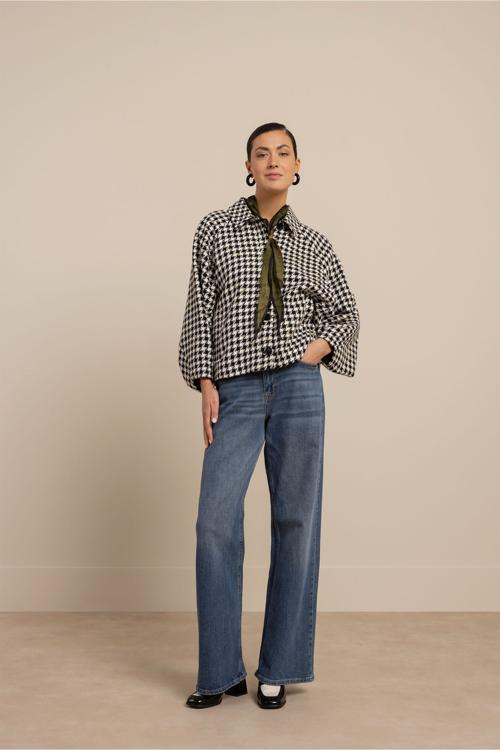 De Clara PDC jacket van Studio Anneloes is een stoer en stijlvol jasje dat direct karakter toevoegt aan je outfit. Het tijdloze pied-de-poule dessin krijgt extra pit door subtiele Dark Lime accenten in de print, waardoor het jasje zowel klassiek als modern aanvoelt.