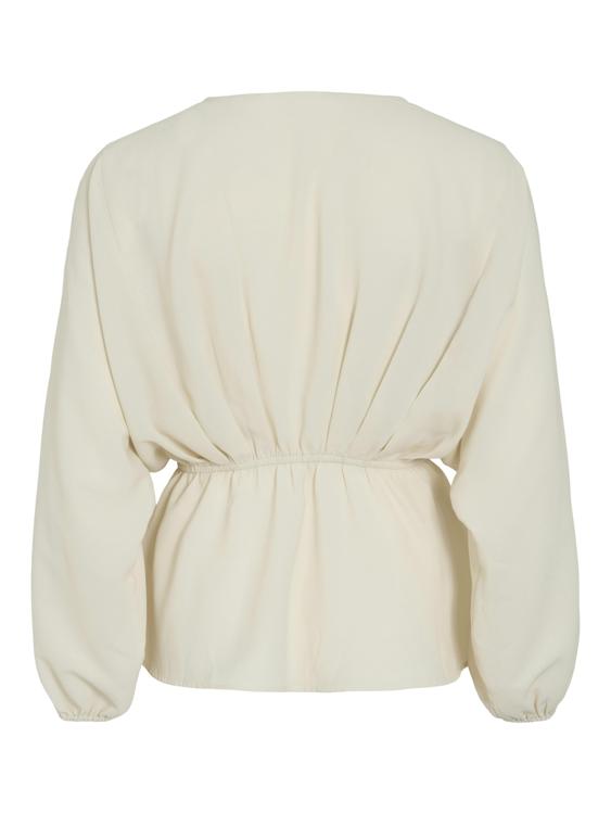 Deze V-hals top van Vila heeft een verfijnde, losvallende pasvorm en een subtiel getailleerd effect dankzij de elastische inzet onder de buste. De lange mouwen met elastische manchetten geven de top een zachte, romantische uitstraling, terwijl de lichte stof zorgt voor een comfortabel en flatterend silhouet. Perfect om zowel casual als chic te stylen.
