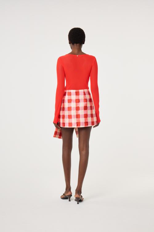 De Fabienne Chapot Beau rok in oranje-rood is een echte eyecatcher. De korte rok is uitgevoerd in een levendig roze-oranje ruitpatroon en voorzien van een opvallende strikdetail aan de voorzijde. Dit geeft de rok een vrouwelijke en speelse uitstraling met een fashionable twist.