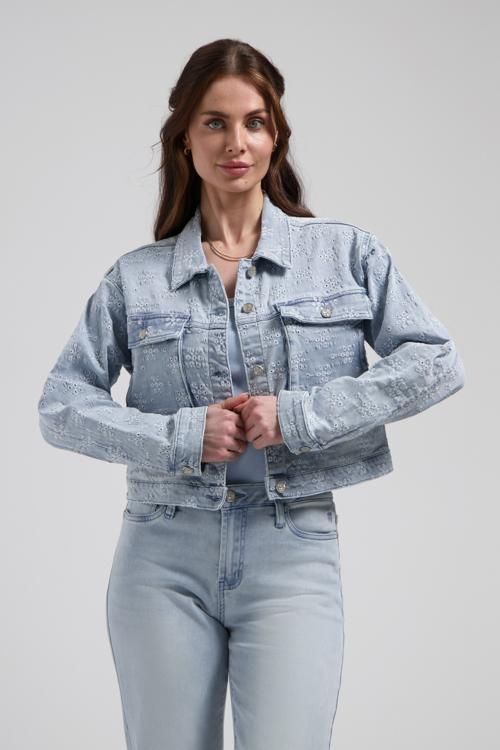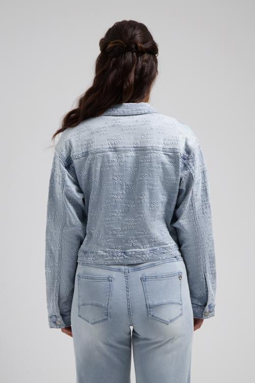 De Thalia Jacket van Florèz is allesbehalve een standaard denimjasje. Dit lichtblauwe model krijgt een unieke uitstraling door het subtiel ingedrukte bloemenpatroon in de stof. Een speels detail dat zorgt voor extra diepte en karakter, zonder zijn stoere denim look te verliezen.