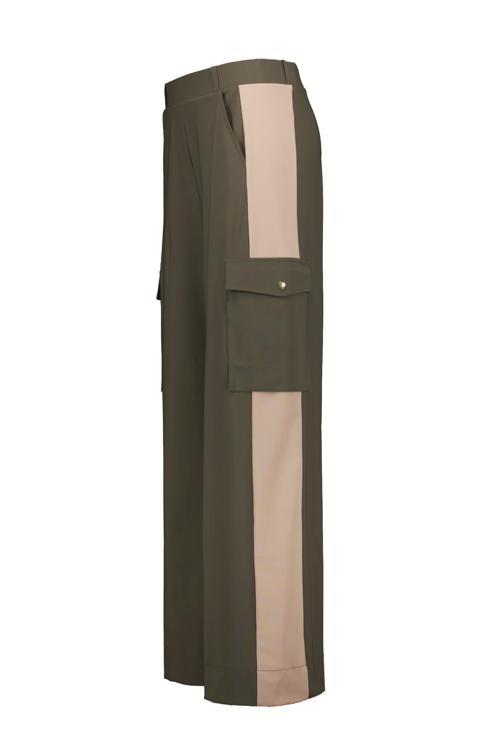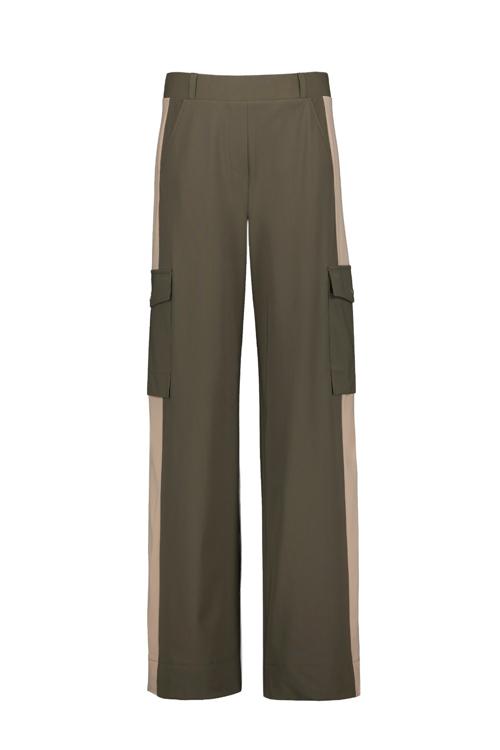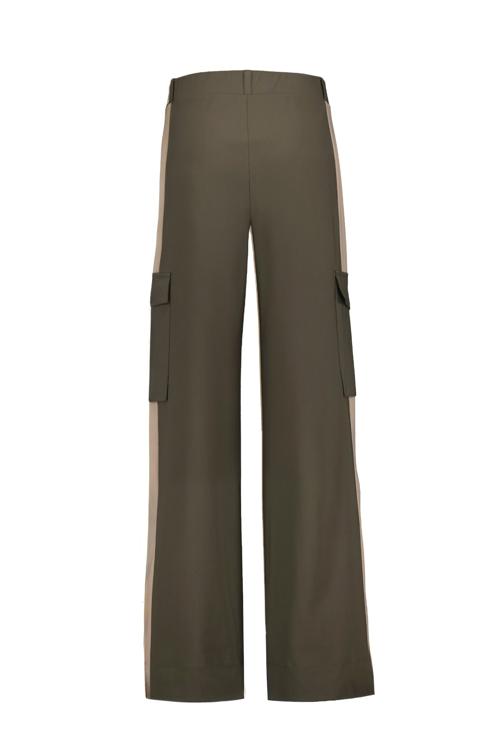 De kleur New Army geeft de broek een rustige en natuurlijke uitstraling. De Latte-kleurige bies langs de pijpen zorgt voor een subtiel contrast en een luxe detail dat de broek nét wat extra karakter geeft. De cargo zakken geven het ontwerp een stoere twist zonder in te leveren op elegantie.