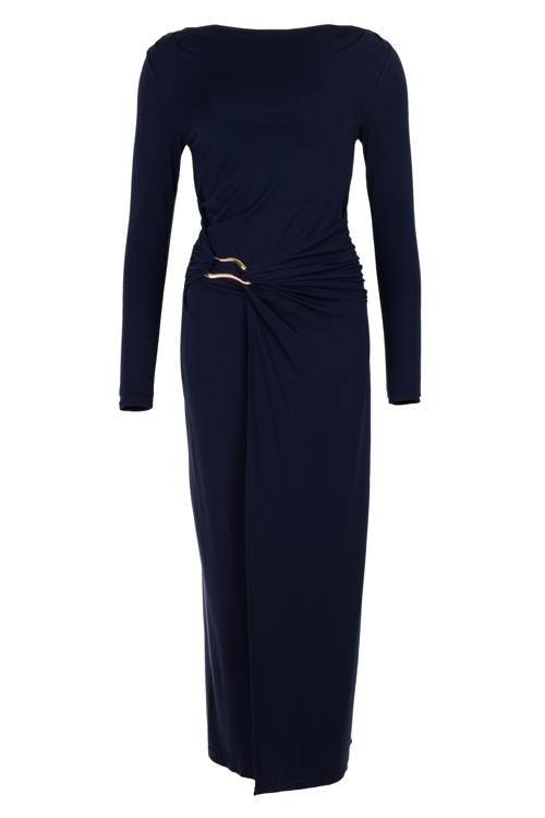 De drapering wordt afgewerkt met een goudkleurige gesp die een luxueus detail toevoegt en de taille extra benadrukt. De lange mouwen geven de jurk een elegante uitstraling en maken dit item perfect voor avondgelegenheden, feestelijke momenten of stijlvolle events.