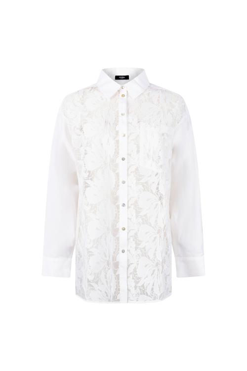 Wat deze blouse bijzonder maakt, is het subtiele materiaalcontrast. De achterzijde en mouwen zijn gemaakt van fris wit katoen, terwijl de voorzijde bestaat uit verfijnd kant zonder voering. Hierdoor ontstaat een luchtig en vrouwelijk effect dat het ontwerp extra karakter geeft. De knopenlijst is uitgevoerd in dicht katoen, wat zorgt voor een mooi evenwicht tussen transparantie en structuur.