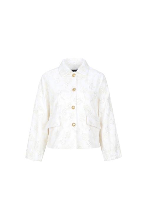 De klassieke kraag en de knoopsluiting met goudkleurige knopen geven het jasje een luxe uitstraling. De subtiele bloemenstructuur in de stof zorgt voor extra diepte en een verfijnde, romantische touch.