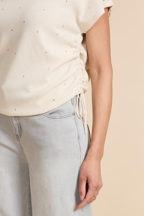 De verfijnde structuur in de stof geeft de top een luxe uitstraling. De verstelbare strikdetails aan de zijkanten zorgen voor een speels accent en maken het mogelijk om de pasvorm subtiel aan te passen. Hierdoor krijgt de top een moderne en eigentijdse uitstraling.